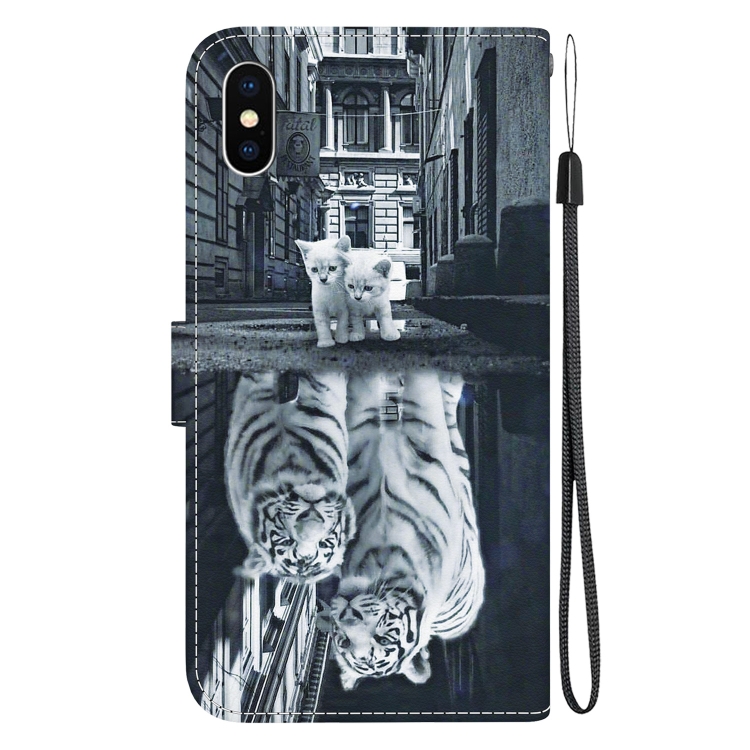 Funda de Cuero para iPhone Xs / X con Dibujo Coloreado y Textura de Cristal (Reflejo de Tigre Gato)