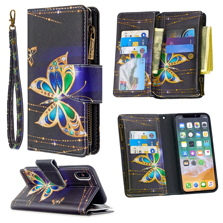 Funda de Cuero para iPhone Xs X con Patrón de Dibujo de Colores Cremallera Tapa Horizontal Soporte Ranuras Tarjetas Billetera (Mariposa Grande)