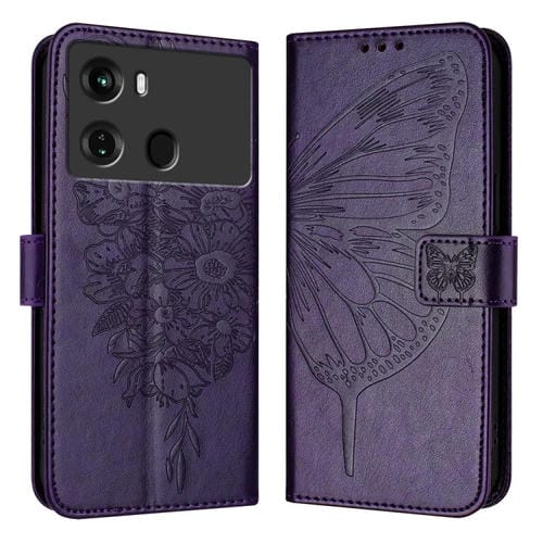 Funda de Cuero para Itel P40 con Mariposa en Relieve (Púrpura Oscuro)