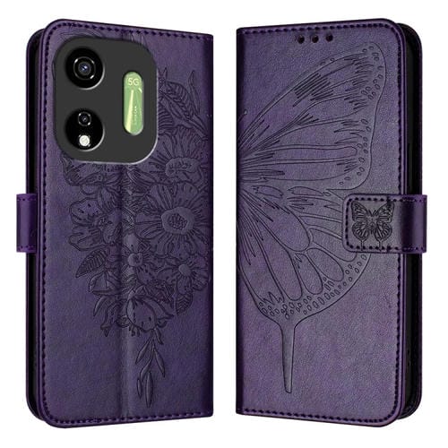 Funda de Cuero para Itel P55 5G con Mariposa en Relieve (Púrpura Oscuro)