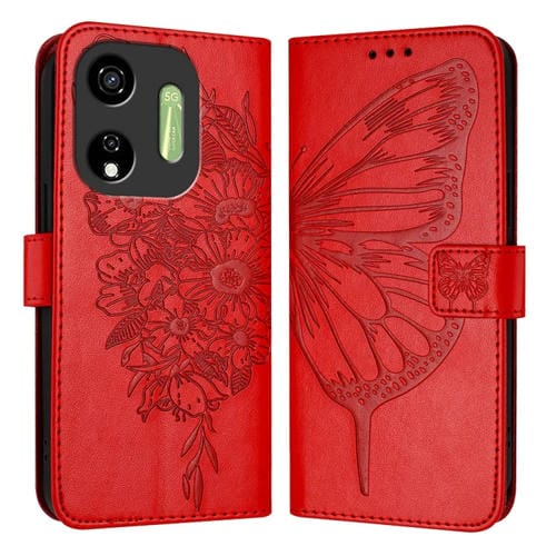 Funda de Cuero para Itel P55 5G con Mariposa en Relieve (Rojo)