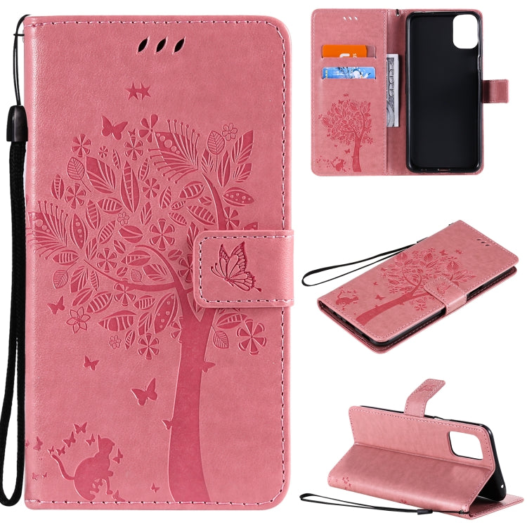Funda de Cuero PU para LG K42 con Patrón Árbol y Gato, Flip Horizontal, Soporte, Billetera y Cordón (Rosa)