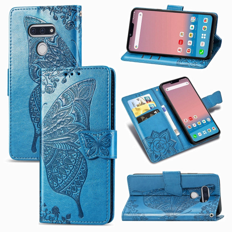 Funda de Cuero LG Style3 L-41A Butterfly Love Flower con Tapa Horizontal, Soporte, Ranura para Tarjeta y Cordón (Azul)