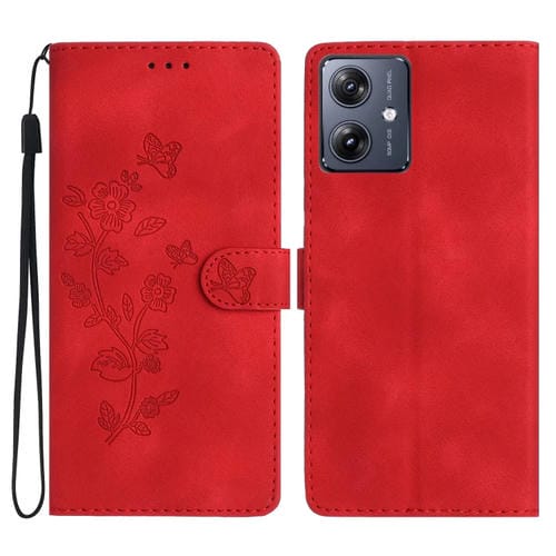 Funda de Cuero para Motorola Moto G54 5G con Estampado de Mariposa y Flor (Rojo)