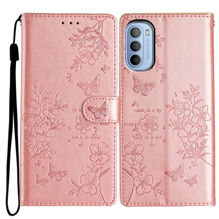 Funda de Cuero para Motorola Moto G62 5G con Mariposas y Flores (Oro Rosa)