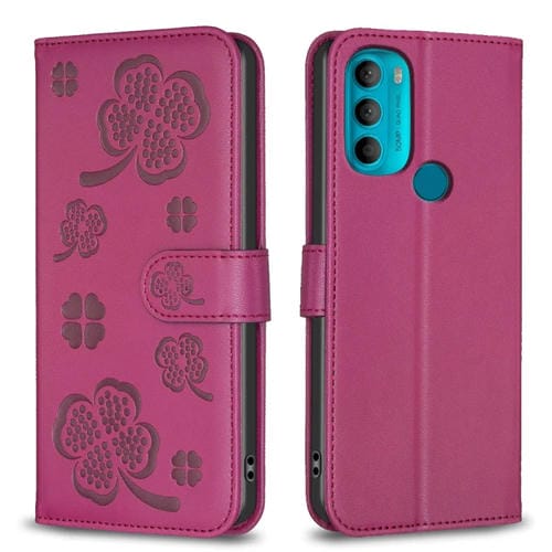 Funda de Cuero para Motorola Moto G71 con Relieve de Cuatro Hojas (Rojo Rosa)