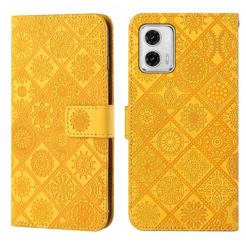 Funda de Cuero para Motorola Moto G73 con Patrón en Relieve Estilo Étnico (Amarillo)