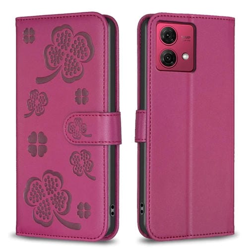 Funda de Cuero para Motorola Moto G84 con Relieve de Cuatro Hojas (Rojo Rosa)