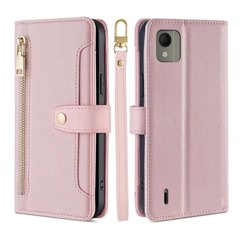 Funda de Cuero para Nokia C110 4G Lite con Billetera, Cremallera y Textura de Oveja (Rosa)