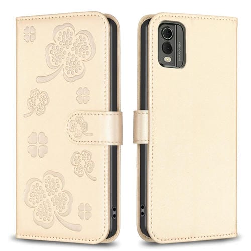 Funda de Cuero para Nokia C12 con Relieve de Cuatro Hojas (Dorado)