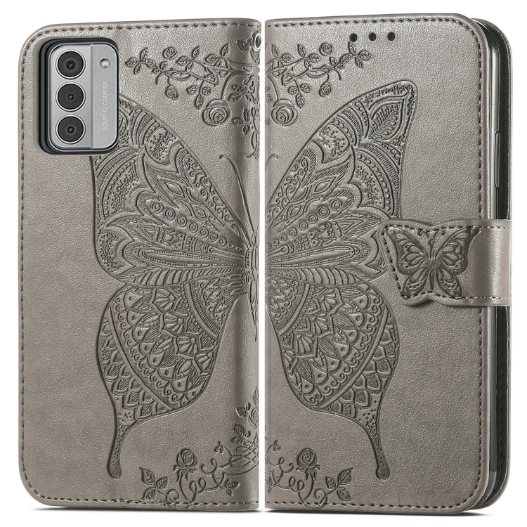 Funda de Cuero para Nokia G42 Butterfly Love Flower en Relieve (Gris)