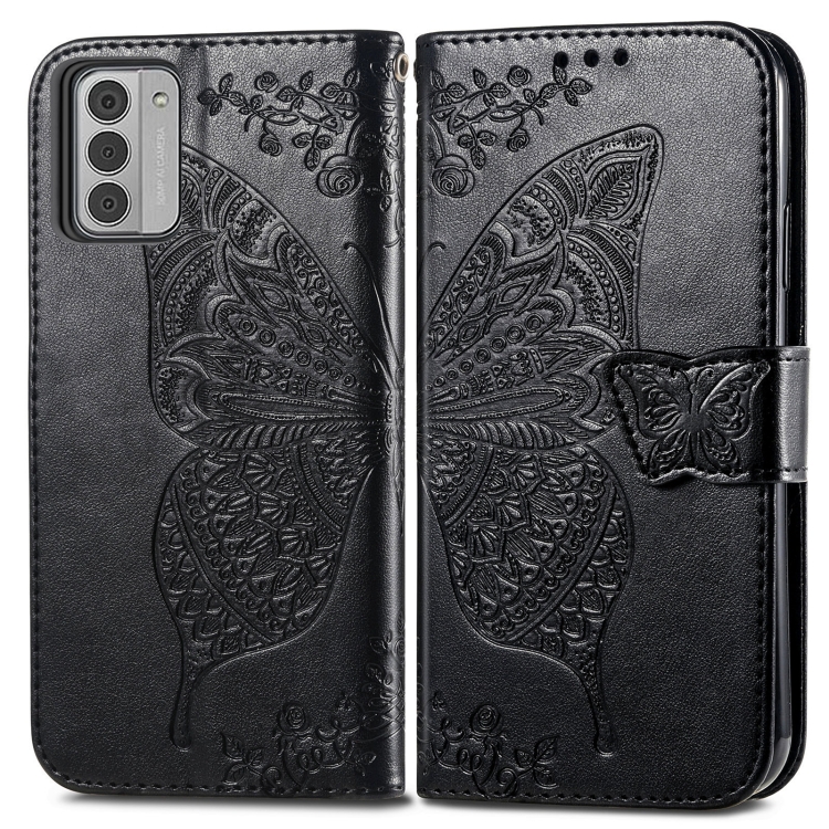 Funda de Cuero para Nokia G42 Butterfly Love Flower con Relieve (Negro)