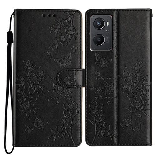 Para Oppo A36 / A76 / A96 Funda para Teléfono de Cuero con Relieve de Flor de Amor y Mariposa (Negro)