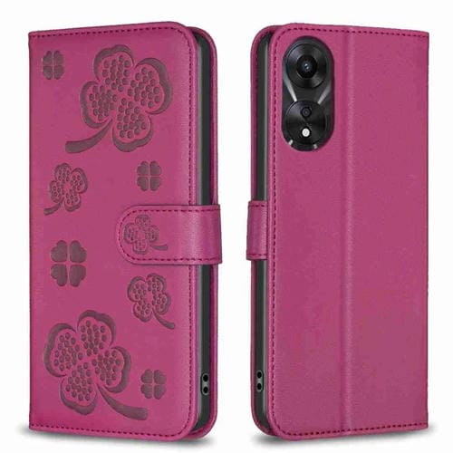 Para Oppo A78 5G Funda para Teléfono de Cuero con Relieve de Cuatro Hojas (Rojo Rosa)