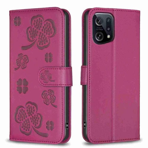 Para Oppo Find X5 Funda para Teléfono de Cuero con Relieve de Cuatro Hojas (Rojo Rosa)