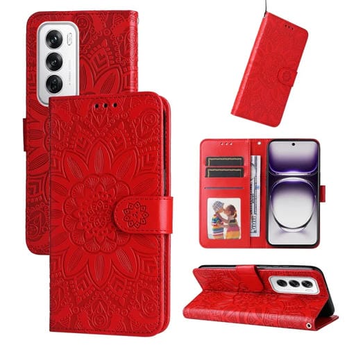Para Oppo Reno12 5G Funda de Teléfono de Cuero con Girasol En Relieve Global (Rojo)
