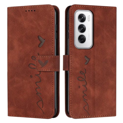 Para Oppo Reno12 5G Global Skin Feel Heart Funda para Teléfono de Cuero En Relieve con Cordón Largo (Marrón)