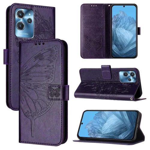 Funda de Cuero para Oukitel C32 con Mariposa en Relieve (Púrpura Oscuro)
