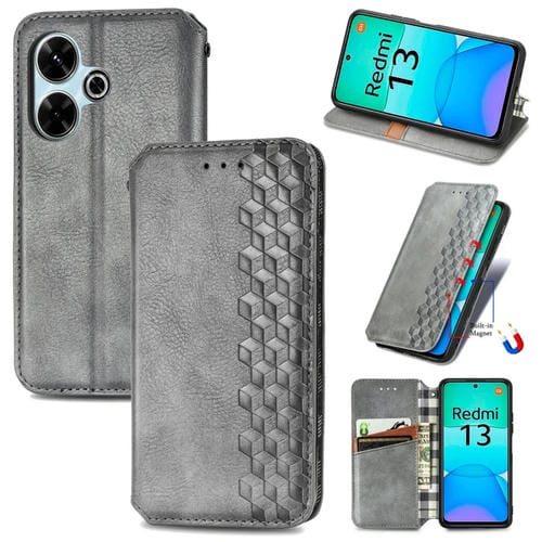 Para Redmi 13 4G Cubic Grid Funda de Teléfono de Cuero Magnético Prensado (Gris)
