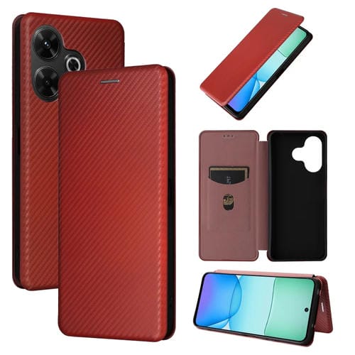 Para Redmi 13 4G Funda de Cuero con Tapa con Textura de Fibra de Carbono (Marrón)