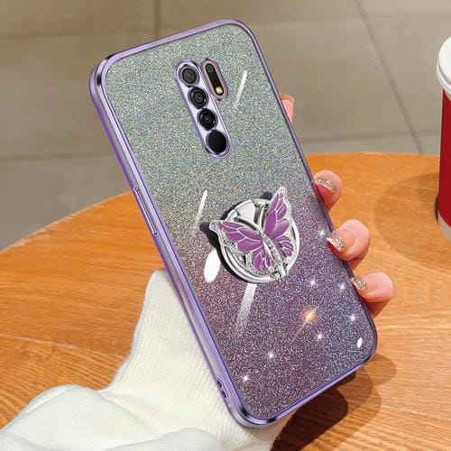 Para Redmi 9 Funda para Teléfono de TPU con Soporte de Mariposa con Brillo Degradado Plateado (Púrpura)