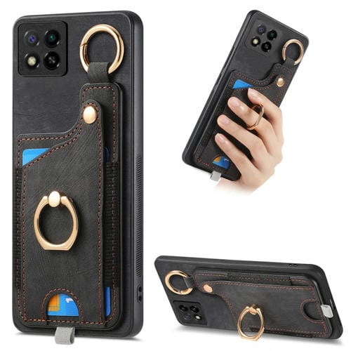 Para Redmi 9C Funda para Teléfono con Bolsa para Tarjeta con Anillo y Sensación de Piel Retro con Lazo para Colgar (Negro)