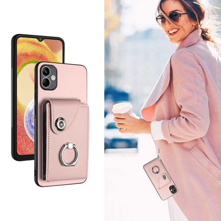 Funda para Teléfono Samsung Galaxy A04 4G de PU con Soporte para Anillo y Bolsa para Tarjeta con Cordón (Rosa)