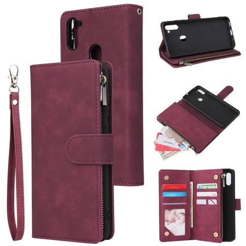 Estuche para Teléfono Samsung Galaxy A11 Cuero con Billetera y Cremallera Multifuncional (Rojo Vino)