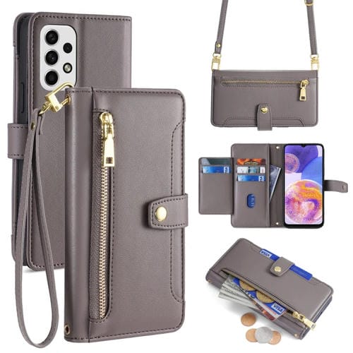 Estuche de Cuero Samsung Galaxy A23 con Billetera, Cremallera y Cuerpo Cruzado con Textura de Oveja (Gris)
