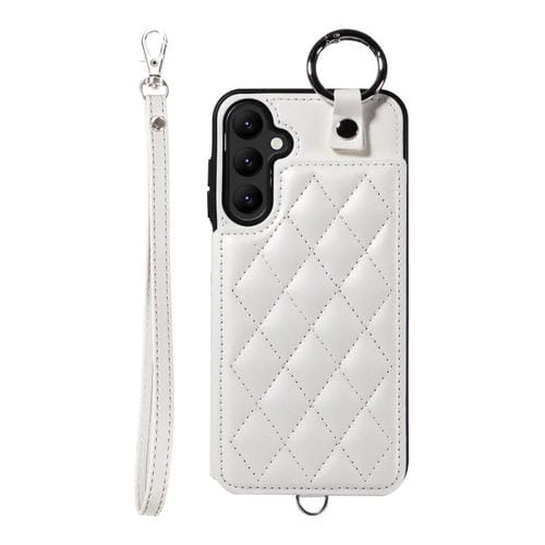 Estuche para Teléfono Samsung Galaxy A24 4G con Bolsa para Tarjetas Textura Rómbica y Cordón Corto (Blanco)