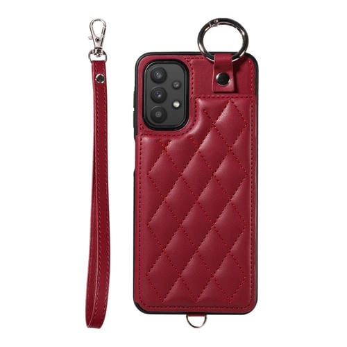 Estuche para Teléfono Samsung Galaxy A32 5G con Bolsa para Tarjetas Textura Rómbica y Cordón Corto (Rojo Vino)