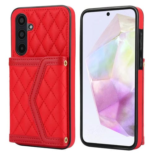 Estuche para Teléfono Samsung Galaxy A35 5G con Bolsa para Tarjetas Textura Rómbica y Cordón Largo (Rojo)