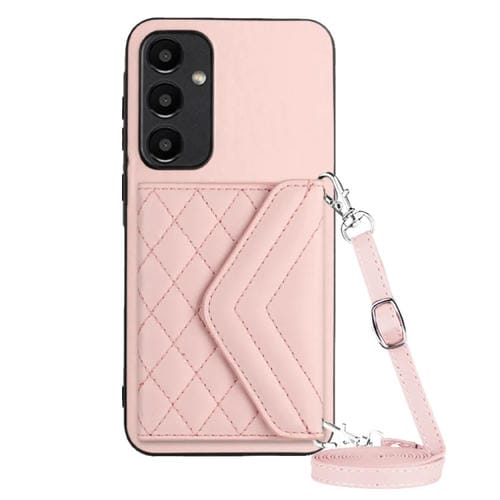 Estuche para Teléfono Samsung Galaxy A35 Rfid con Bolsa para Tarjetas Textura Rómbica y Cordón Largo (Oro Rosa)