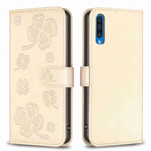 Funda para Samsung Galaxy A50 Cuero con Relieve de Cuatro Hojas (Dorado)