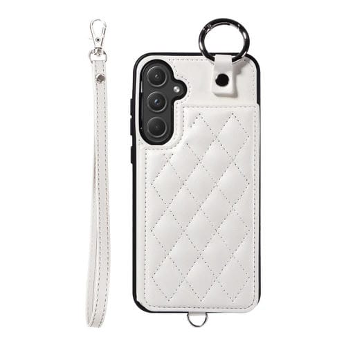 Estuche para Teléfono Samsung Galaxy A55 5G con Bolsa para Tarjetas Textura Rómbica y Cordón Corto (Blanco)