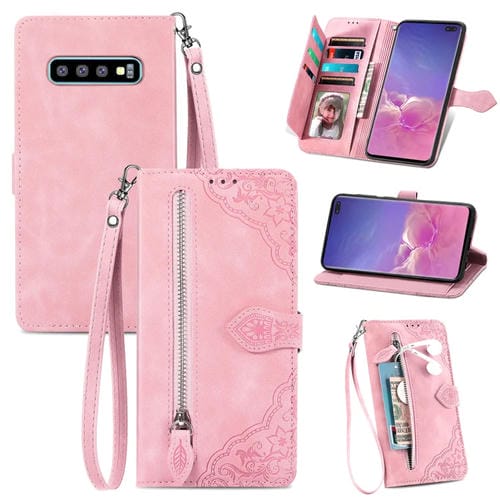 Funda de Cuero para Samsung Galaxy S10 con Cremallera y Flores en Relieve (Rosa)