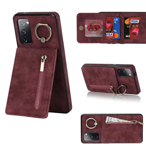 Estuche para Teléfono Samsung Galaxy S20 FE Retro Ring And Zipper Ranura para Tarjeta Rfid (Rojo Vino)