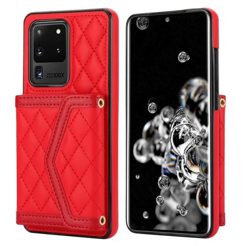 Estuche para Teléfono Samsung Galaxy S20 Ultra Empalme Textura Rómbica Bolsa para Tarjetas con Cordón Largo (Rojo)