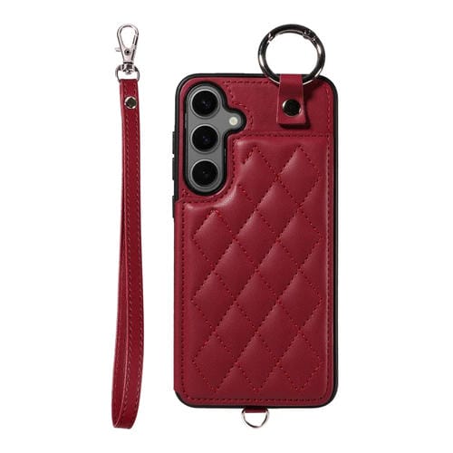 Estuche para Teléfono Samsung Galaxy S24 + 5G con Bolsa para Tarjetas Textura Rómbica y Cordón Corto (Rojo Vino)