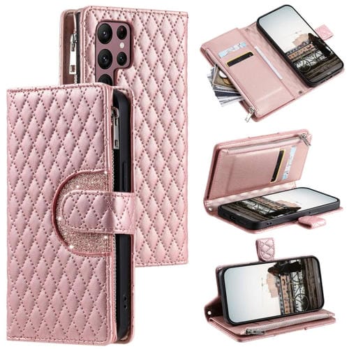 Estuche para Teléfono Samsung Galaxy S24 Ultra 5G Cuero con Billetera Cremallera y Celosía con Purpurina (Oro Rosa)