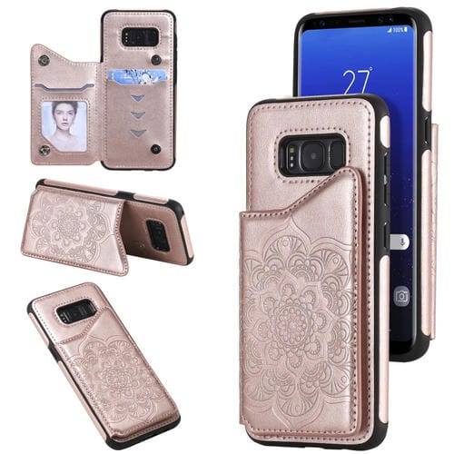 Estuche protector para Samsung Galaxy S8 Flower Patrón grabado en relieve con soporte, ranuras para tarjetas y marco de fotos (Oro Rosa)