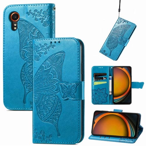 Funda para Teléfono Samsung Galaxy Xcover 7 Cuero con Relieve de Flor y Mariposa (Azul)