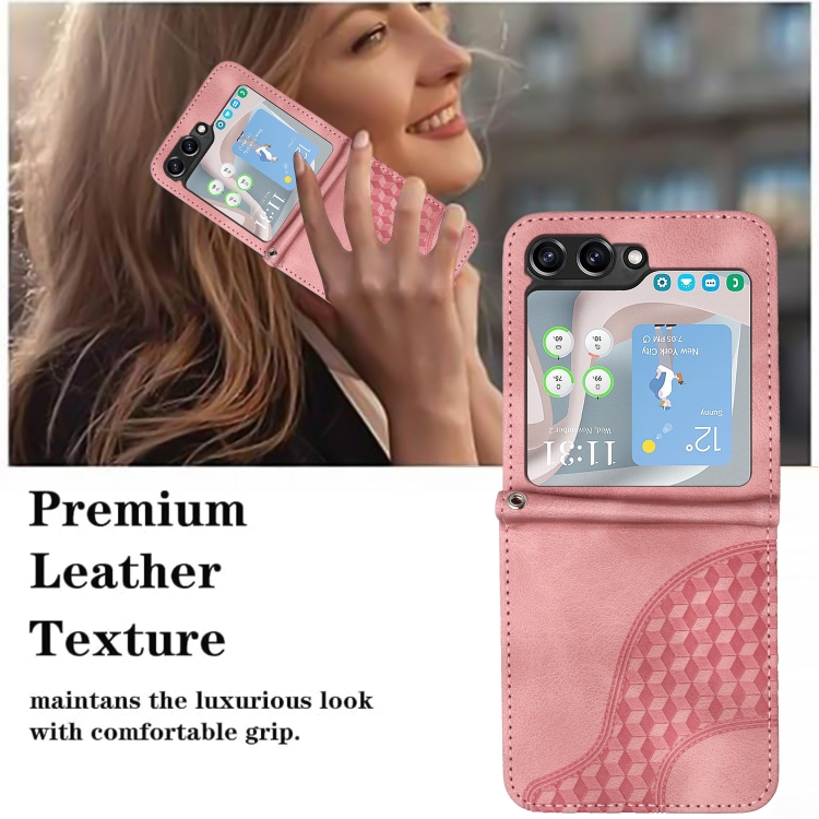 Funda de Cuero Samsung Galaxy Z Flip5 5G Yx0060 con Relieve Cabeza de Elefante y Cordón (Rosa)
