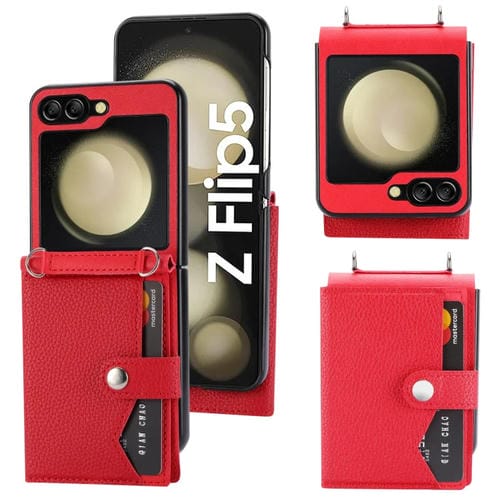 Funda para teléfono Samsung Galaxy Z Flip5 Litchi Pattern con tarjetero y cordón largo (Rojo)