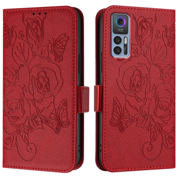 Funda para TCL 30 5G 4G 30+ Cuero Antirrobo RFID con Rosa En Relieve (Rojo)