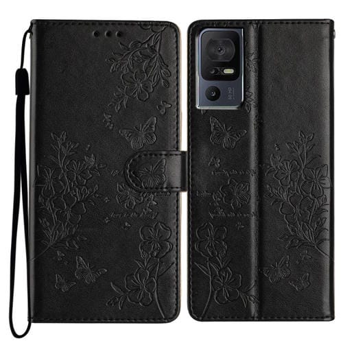 Funda de Cuero para TCL 40 Se Butterfly Love Flower con Relieve (Negro)