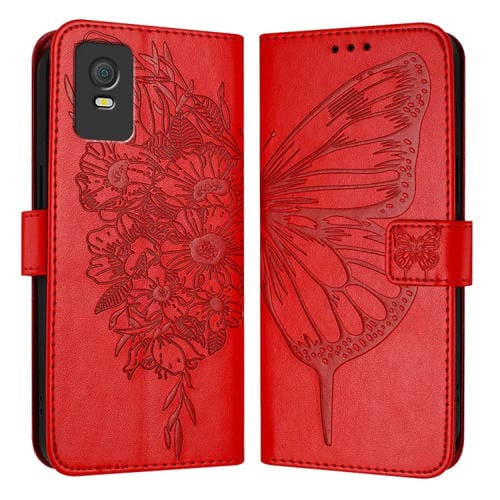 Funda de Cuero para TCL 403 con Mariposa en Relieve (Rojo)