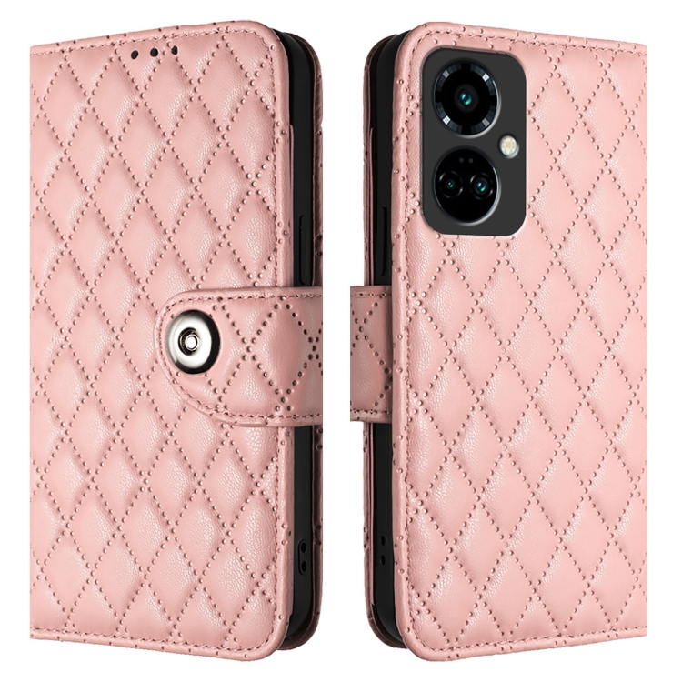 Funda de Cuero para Tecno Camon 19 Pro 5G con Tapa Textura Romboidal y Cordón (Rosa Coral)