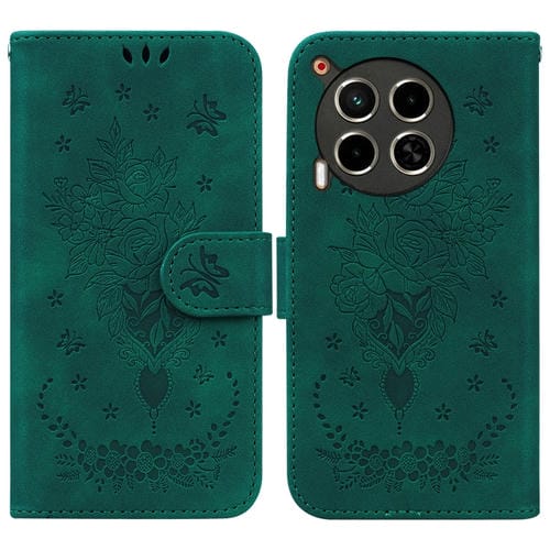 Funda para Tecno Camon 30 4G y 5G de Cuero con Relieve Mariposa y Rosa (Verde)