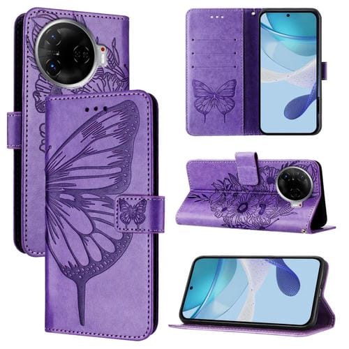 Funda de Cuero para Tecno Camon 30 Pro con Mariposa en Relieve (Púrpura Claro)